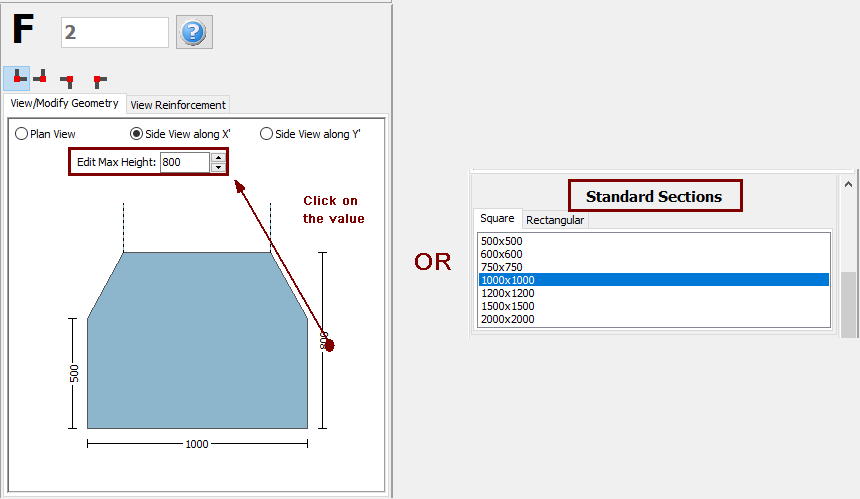 On the individual footing's Properties Window users can adapt the section’s dimensions either in the View/Modify Geometry window or by selecting one section from the predefined standard sections.