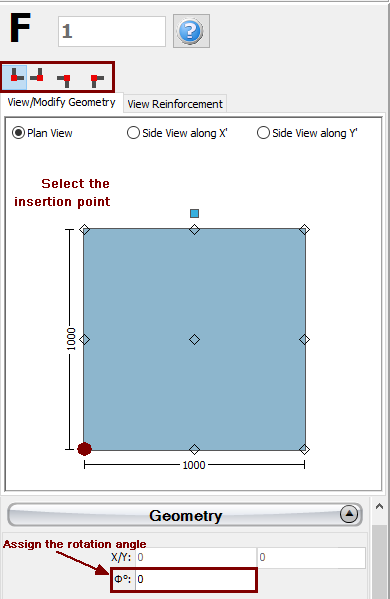 Finally, the insertion point (point of the section that corresponds to the location of the mouse click) may be chosen by clicking on the corner, middle or side points of the section's plot on the Properties Window, whereas the rotation of the column on plan-view can be changed by the 0o, 90o, 180o and 270o buttons or by assigning the proper angle on the corresponding of editbox of the Properties Window.