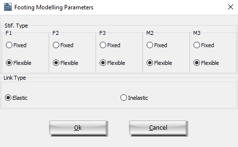 The footing modelling parameters of the structural member can also be defined through the Footing Modelling Parameters dialog box that opens from the corresponding button.