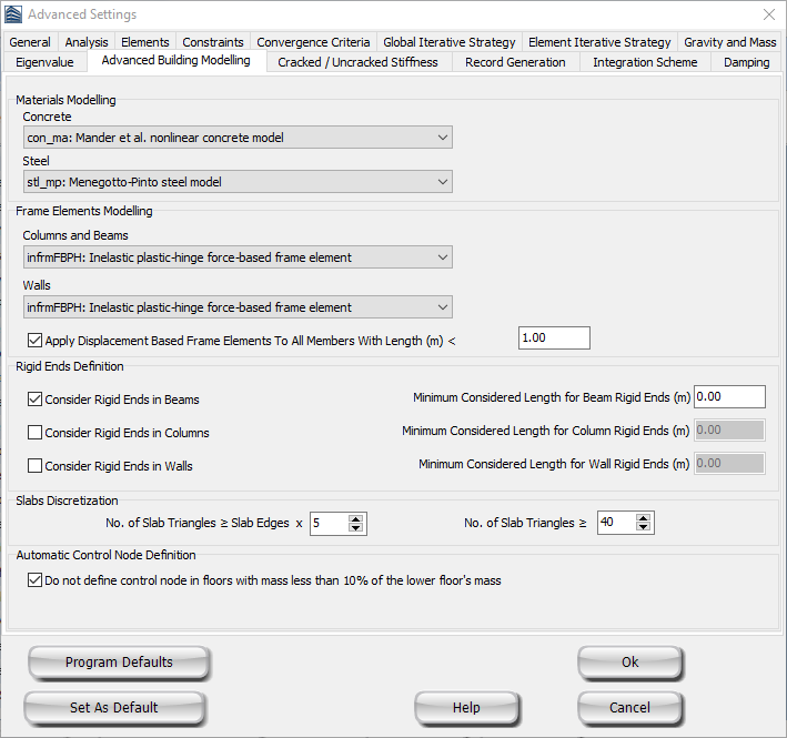 For each SeismoBuild project it is possible to customise both the usability of the program as well as the performance characteristics of analytical proceedings, so as to better suit the needs of any given structural model and/or the preferences of a particular user. This program/project tweaking facility is available from the Analysis Parameters module or the Advanced Settings panel, which can be accessed through the Advanced Settings button.