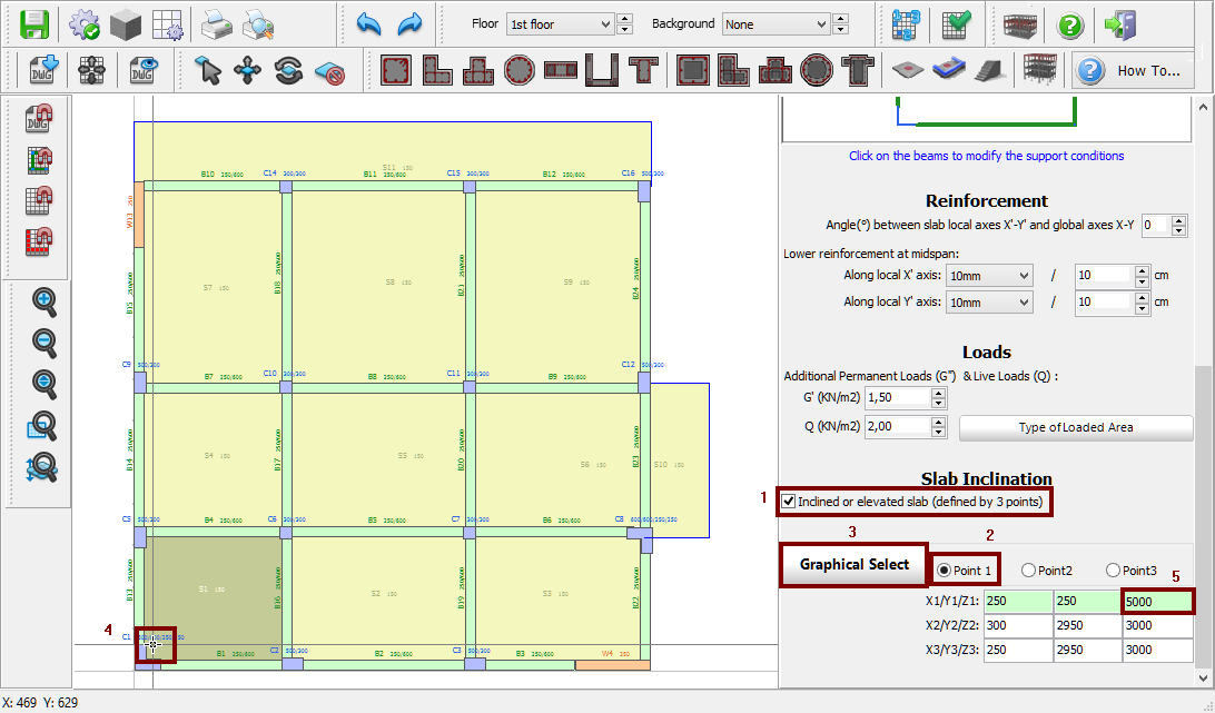 - select the Inclined or elevated slab checkbox (three points need to be selected graphically to specify the slab elevation);