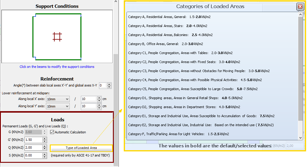 The self-weight of the slabs may be automatically calculated and included in the structural model or a user-defined value may be used. The slab's additional permanent and live loads can be defined either manually or by selecting the appropriate type of loaded area from the corresponding list. The snow load is required only by ASCE 41-23 and TBDY.