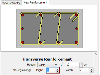 Further, the transverse reinforcement may be specified, in terms of the stirrups' diameters and legs, as well as the distance between them.