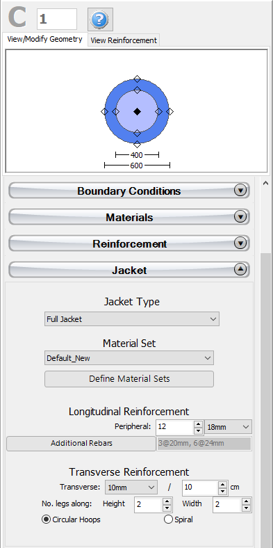Jacket may be applied to the section in the Jacket area by selecting the full jacket type and assigning the material set and the longitudinal and transverse reinforcement of the jacket.