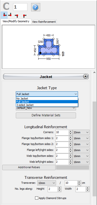 Jackets may be applied to the section in the Jacket area by selecting the jacket type, i.e. whether it is full jacketed or 3-sided jacket, and assigning the material set and the longitudinal and transverse reinforcement of the jacket.