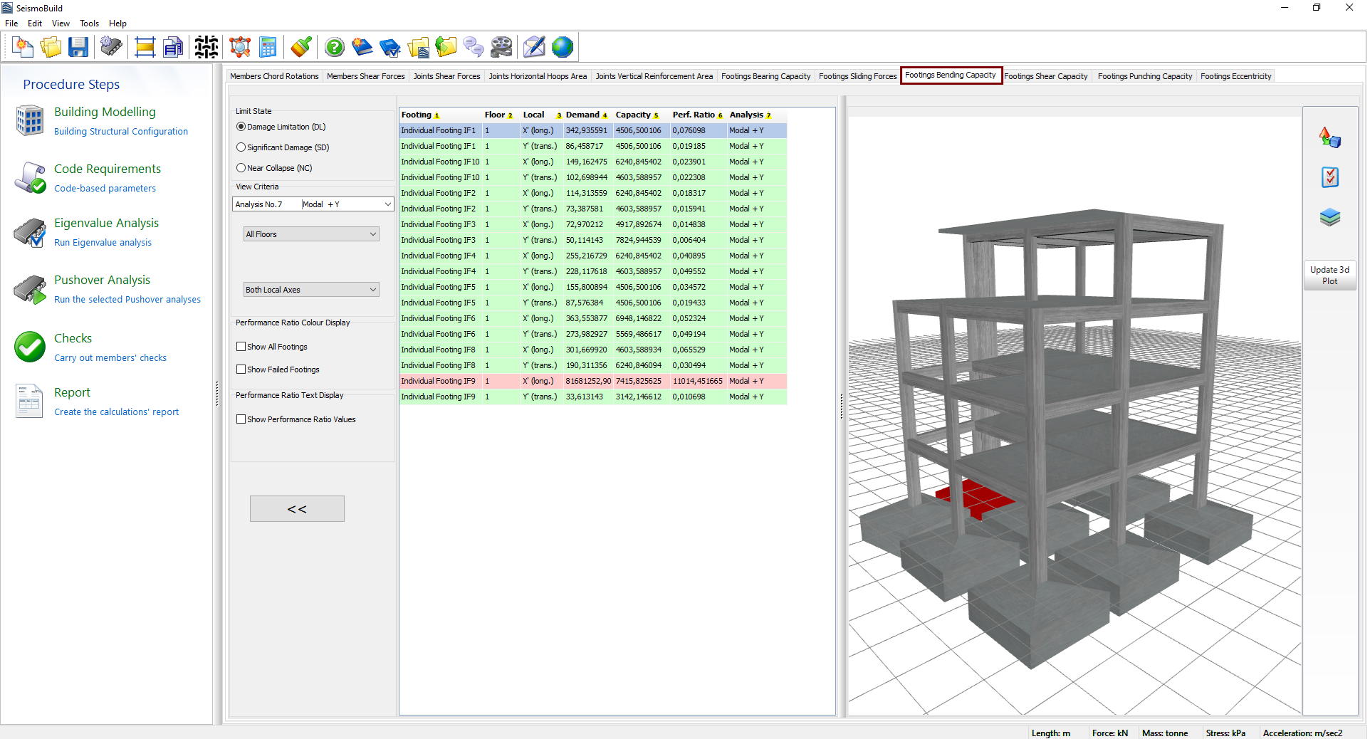 Herein the results of the bending capacity checks for individual and strip footings, according to the selected Code, can be visualised in this module. Users may select for which Limit State, or Performance objective, to view the results and choose filters, which include the determination of the analysis, the floor and the local axis. The available limit states are those already selected in the Limit States module in Code Requirements. In addition, in the drop-down menu for the analysis selection apart from the executed analyses there is an option called Critical Analysis, which is the envelope of the results of all the analyses. The elements that have exceeded their bending capacity are marked with red both in the table view and the 3D view format, whereas different visualisation options are available. For instance users may select to display the footings’ performance ratios or each footing’s critical analysis on the 3D plot, or to display the footings with different colours, depending on the value of their performance ratio for the selected limit state.