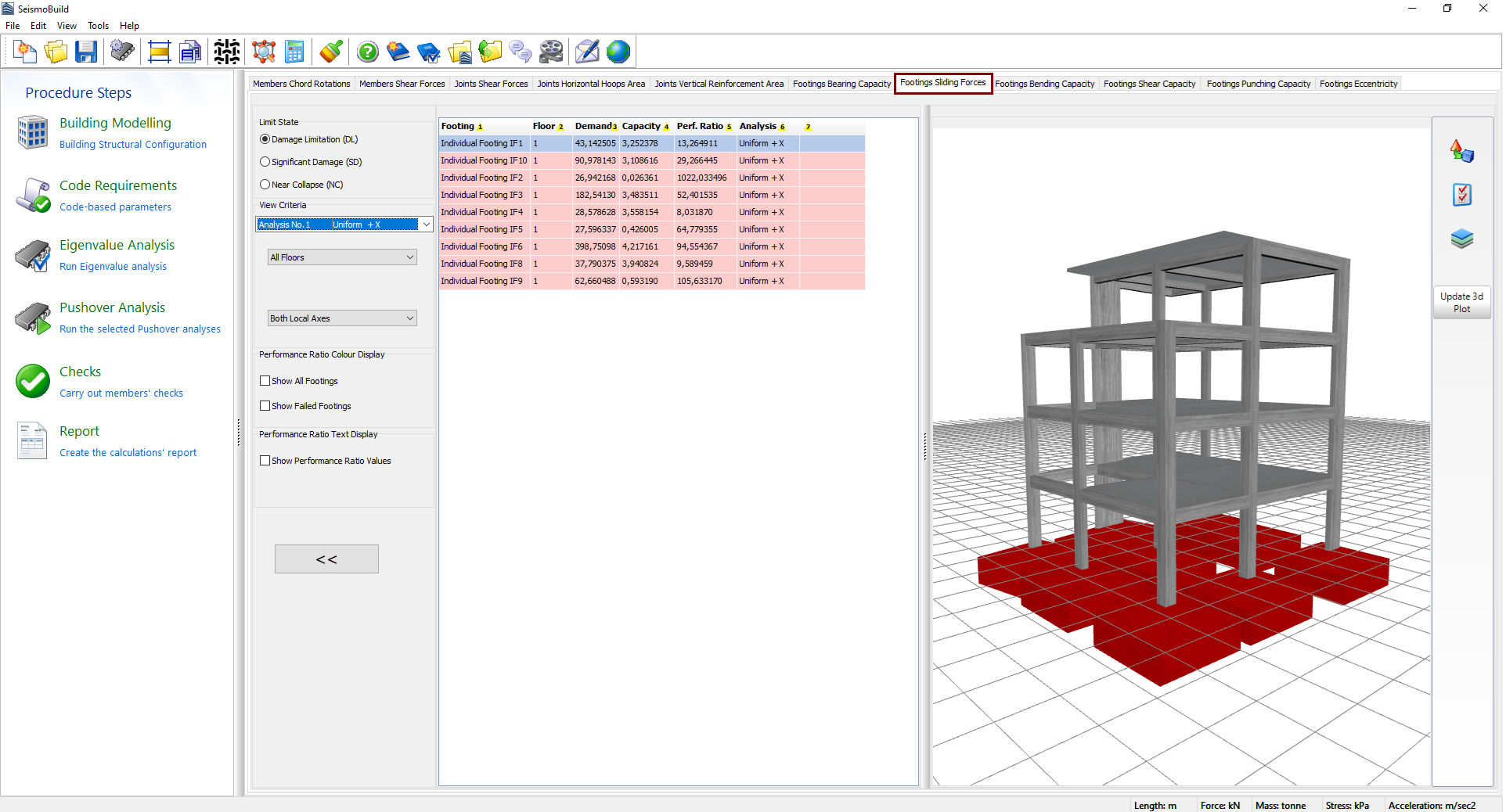 Herein rhe results of the sliding forces checks for individual and strip footings, according to the selected Code, can be visualised in this module. Users may select for which Limit State, or Performance objective, to view the results and choose filters, which include the determination of the analysis, the floor and the local axis. The available limit states are those already selected in the Limit States module in Code Requirements. In addition, in the drop-down menu for the analysis selection apart from the executed analyses there is an option called Critical Analysis, which is the envelope of the results of all the analyses. The elements with sliding failure are marked with red both in the table view and the 3D view format, whereas different visualisation options are available. For instance users may select to display the footings’ performance ratios or each footing’s critical analysis on the 3D plot, or to display the footings with different colours, depending on the value of their performance ratio for the selected limit state.