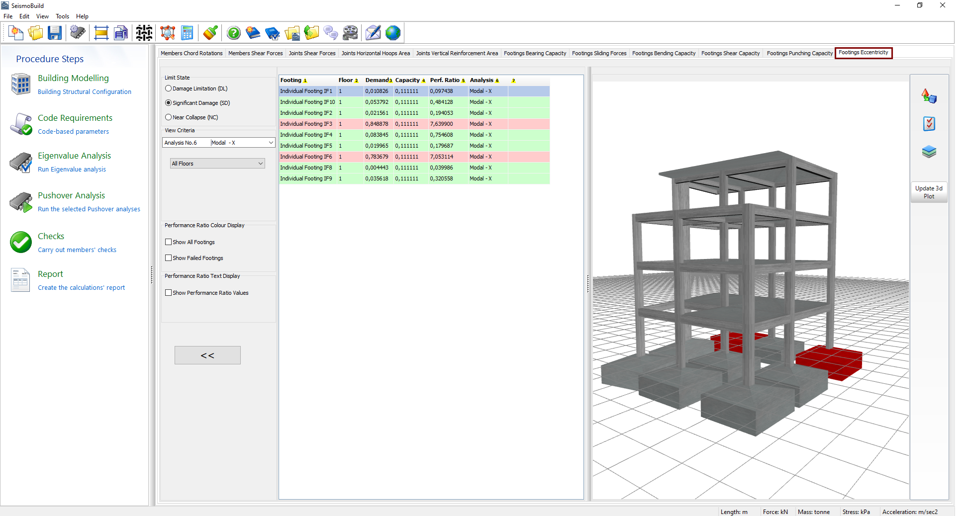 Herein the results of the eccentricity of loading checks for individual and strip footings, according to the selected Code, can be visualised in this module. Users may select for which Limit State, or Performance objective, to view the results and choose filters, which include the determination of the analysis, the floor and the local axis. The available limit states are those already selected in the Limit States module in Code Requirements. In addition, in the drop-down menu for the analysis selection apart from the executed analyses there is an option called Critical Analysis, which is the envelope of the results of all the analyses. The elements that have exceeded the acceptable eccentricity of loading according to the selected Code are marked with red both in the table view and the 3D view format, whereas different visualisation options are available. For instance users may select to display the footings’ performance ratios or each footing’s critical analysis on the 3D plot, or to display the footings with different colours, depending on the value of their performance ratio for the selected limit state.