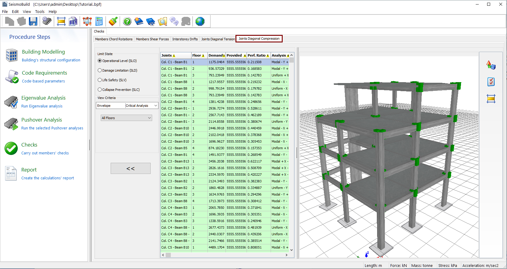 Herein the results of the diagonal compression for beam-column joints are presented (this check applies to NTC and KANEPE). Users may select for which Limit State to view the results as well as the View criteria, which include the determination of the analysis and the floor. The limit states available are those already selected in the Limit States module in Code Requirements. In addition, in the drop-down menu for the analysis selection apart from the executed analyses there is an option called Critical Analysis, which is the envelope of the results of all the analyses. The joints that have exceeded their diagonal compressive stress capacity are marked with red both in the table view and the 3D view format, whereas different visualisation options are available. For instance users may select to display the members’ performance ratios or each member’s critical analysis on the 3D plot, or to display the elements with different colours, depending on the value of their performance ratio for the selected limit state.