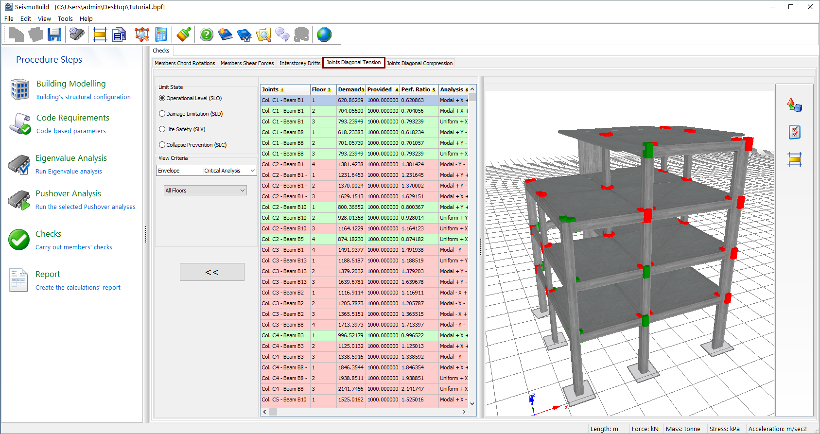 Herein the results of the diagonal tension for beam-column joints are presented (this check applies to NTCand KANEPE). Users may select for which Limit State to view the results and choose filters, which include the determination of the analysis and the floor. The limit states available are those already selected in the Limit States module in Code Requirements. In addition, in the drop-down menu for the analysis selection apart from the executed analyses there is an option called Critical Analysis, which is the envelope of the results of all the analyses. The joints that have exceeded their diagonal tensile stress capacity are marked with red both in the table view and the 3D view format, whereas different visualisation options are available. For instance users may select to display the members’ performance ratios or each member’s critical analysis on the 3D plot, or to display the elements with different colours, depending on the value of their performance ratio for the selected limit state.