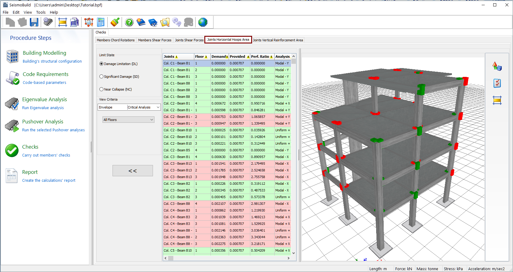 Herein the results of the horizontal hoops area checks for beam–column joints are exported (this check applies only to Eurocode 8). Users may select for which Limit State to view the results and choose filters, which include the determination of the analysis and the floor. The limit states available are those already selected in the Limit States module in Code Requirements. In addition, in the drop-down menu for the analysis selection apart from the executed analyses there is an option called Critical Analysis, which is the envelope of the results of all the analyses. The joints that do not satisfy the horizontal hoops area requirement are marked with red both in the table view and the 3D view format, whereas different visualisation options are available. For instance users may select to display the members’ performance ratios or each member’s critical analysis on the 3D plot, or to display the elements with different colours, depending on the value of their performance ratio for the selected limit state.