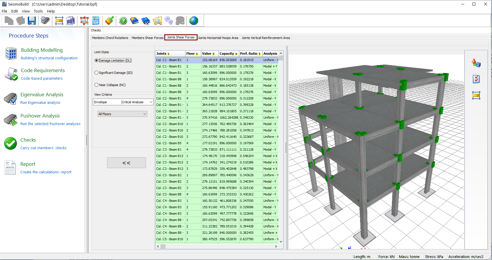 Herein the results of the shear forces checks for beam-column joints, according to the selected Code, are exported (this check applies to Eurocodes, ASCE 41-23 and TBDY). Users may select for which Limit State to view the results and choose filters, which include the determination of the analysis, and the floor. The limit states available are those already selected in the Limit States module in Code Requirements. In addition, in the drop-down menu for the analysis selection apart from the executed analyses there is an option called Critical Analysis, which is the envelope of the results of all the analyses. The joints that have exceeded their shear capacity are marked with red both in the table view and the 3D view format, whereas different visualisation options are available. For instance users may select to display the members’ performance ratios or each member’s critical analysis on the 3D plot, or to display the elements with different colours, depending on the value of their performance ratio for the selected limit state.