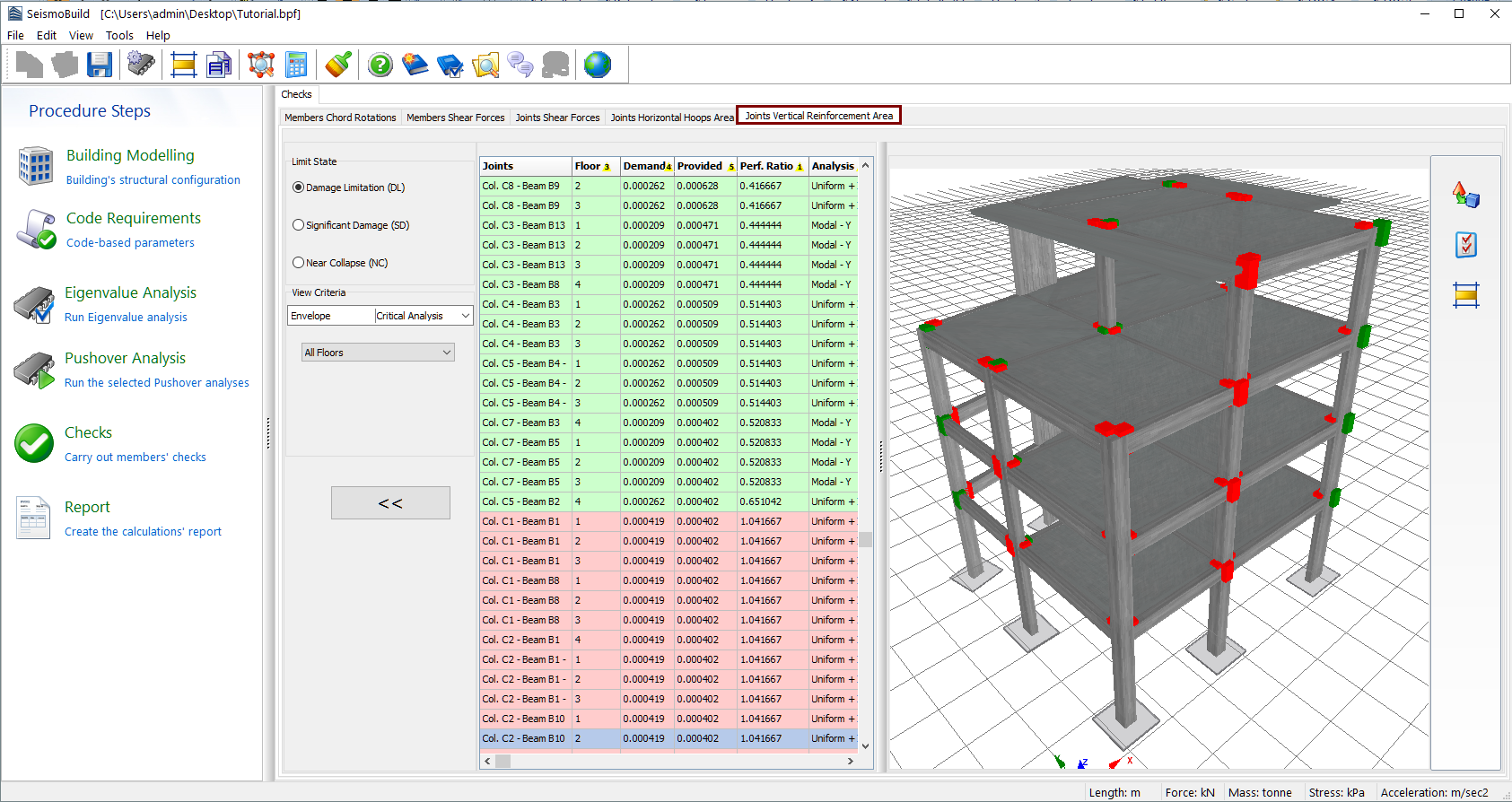 Herein the results of the vertical reinforcement area checks for beam–column joints are presented (this check applies only to Eurocode 8). Users may select for which Limit State to view the results and choose filters, which include the determination of the analysis and the floor. The limit states available are those already selected in the Limit States module in Code Requirements. In addition, in the drop-down menu for the analysis selection apart from the executed analyses there is an option called Critical Analysis, which is the envelope of the results of all the analyses. The joints whose vertical reinforcement area is less than the Code defined are marked with red both in the table view and the 3D view format, whereas different visualisation options are available. For instance users may select to display the members’ performance ratios or each member’s critical analysis on the 3D plot, or to display the elements with different colours, depending on the value of their performance ratio for the selected limit state.