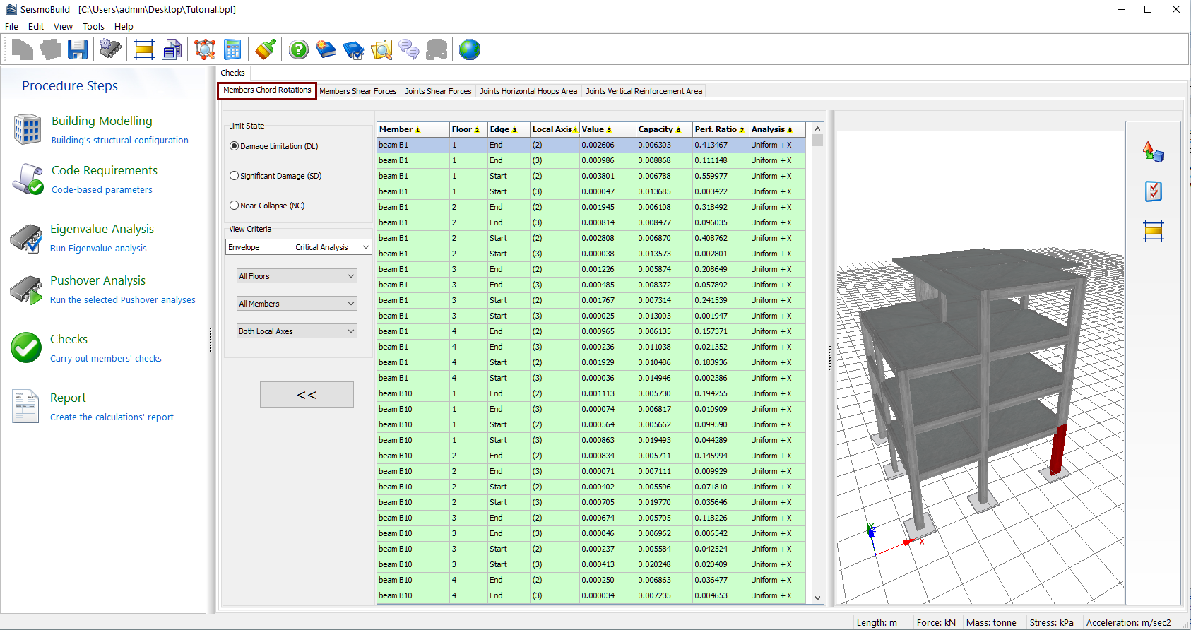 Herein the results of the deformation capacity checks for beams, columns and walls, according to the selected Code, are exported. Users may select, for which Limit State or Performance objective, to view the results and choose filters, which include the analysis number, the floor, the members’ type and the local axis. The limit states available are those already selected in the Limit States module in Code Requirements. Further, in the drop-down menu for the analysis selection apart from the executed analyses there is an option called Critical Analysis, which is the envelope of the results of all the analyses. The elements that have exceeded their deformation capacity are marked with red both on the table and the 3D plot view, whereas different visualisation options are available. For instance users may select to display the members’ performance ratios or each member’s critical analysis on the 3D plot, or to display the elements with different colours, depending on the value of their performance ratio for the selected limit state.
