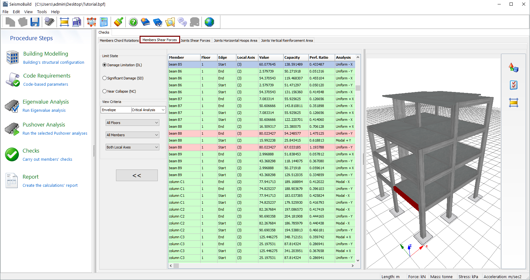 Herein the results of the shear capacity checks for beams, columns and walls, according to the selected Code, are exported. Users may select for which Limit State, or Performance objective, to view the results and choose filters, which include the determination of the analysis, the floor, the members’ type and the local axis. The limit states available are those already selected in the Limit States module in Code Requirements. In addition, in the drop-down menu for the analysis selection apart from the executed analyses there is an option called Critical Analysis, which is the envelope of the results of all the analyses. The elements that have exceeded their shear capacity are marked with red both in the table view and the 3D view format, whereas different visualisation options are available. For instance users may select to display the members’ performance ratios or each member’s critical analysis on the 3D plot, or to display the elements with different colours, depending on the value of their performance ratio for the selected limit state.
