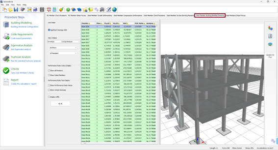 Herein the results of the buckling bending moment check for steel members, according to the selected Code, are exported. Users may select for which Limit State, or Performance objective, to view the results and choose filters, which include the determination of the analysis and the floor. The limit states available are those already selected in the Limit States module in Code Requirements. In addition, in the drop-down menu for the analysis selection apart from the executed analyses there is an option called Critical Analysis, which is the envelope of the results of all the analyses. The elements that have exceeded their buckling bending moment are marked with red both in the table view and the 3D view format, whereas different visualisation options are available. For instance users may select to display the members’ performance ratios or each member’s critical analysis on the 3D plot, or to display the elements with different colours, depending on the value of their performance ratio for the selected limit state.