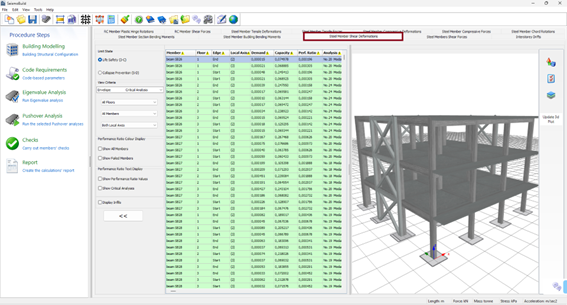 Herein the results of the shear deformations check for steel members, according to the selected Code, are exported. Users may select for which Limit State, or Performance objective, to view the results and choose filters, which include the determination of the analysis and the floor. The limit states available are those already selected in the Limit States module in Code Requirements. In addition, in the drop-down menu for the analysis selection apart from the executed analyses there is an option called Critical Analysis, which is the envelope of the results of all the analyses. The elements that have exceeded their shear deformations capacity are marked with red both in the table view and the 3D view format, whereas different visualisation options are available. For instance users may select to display the members’ performance ratios or each member’s critical analysis on the 3D plot, or to display the elements with different colours, depending on the value of their performance ratio for the selected limit state.