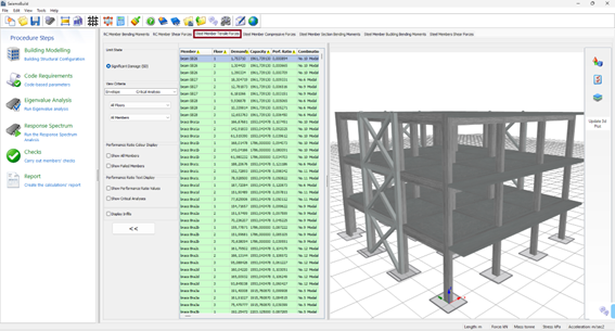 Herein the results of the tensile forces check for steel Members, according to the selected Code, are exported. Users may select for which Limit State, or Performance objective, to view the results and choose filters, which include the determination of the analysis and the floor. The limit states available are those already selected in the Limit States module in Code Requirements. In addition, in the drop-down menu for the analysis selection apart from the executed analyses there is an option called Critical Analysis, which is the envelope of the results of all the analyses. The elements that have exceeded their tensile force capacity are marked with red both in the table view and the 3D view format, whereas different visualisation options are available. For instance users may select to display the members’ performance ratios or each member’s critical analysis on the 3D plot, or to display the elements with different colours, depending on the value of their performance ratio for the selected limit state.