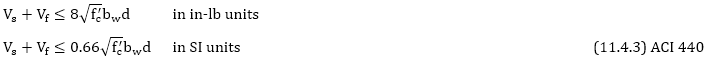 Note: The total shear strength provided by the sum of the FRP shear reinforcement and the steel shear reinforcement should be limited as indicated in the equation below: