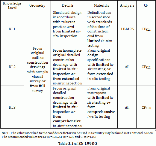 In the following table of EN1998-3 a summary and recommendations for the confidence factors and the analysis methods are provided for each knowledge level.