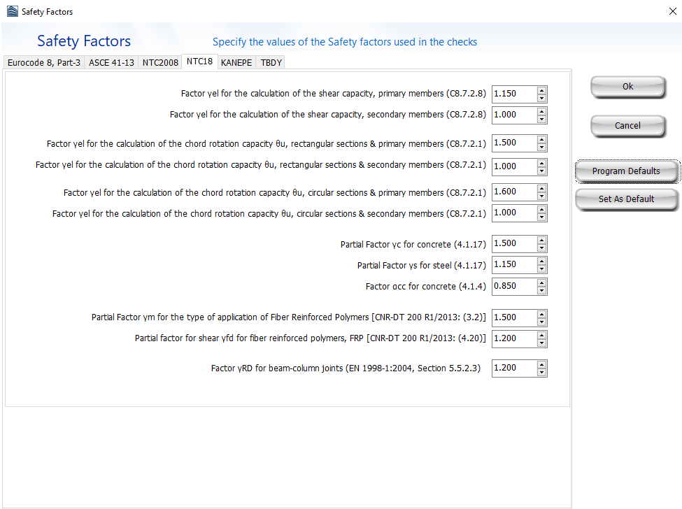 The recommended values for the safety and partial factors, as defined in NTC-18, are introduced in the Safety Factors module. Users may edit and change the default values.