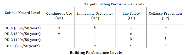 The target building performance levels refer to the state of damage in the structure defined through four limit states, namely Continuous Use (KK), Immediate Occupancy (HK), Life Safety (CG) and Collapse Prevention (BP).