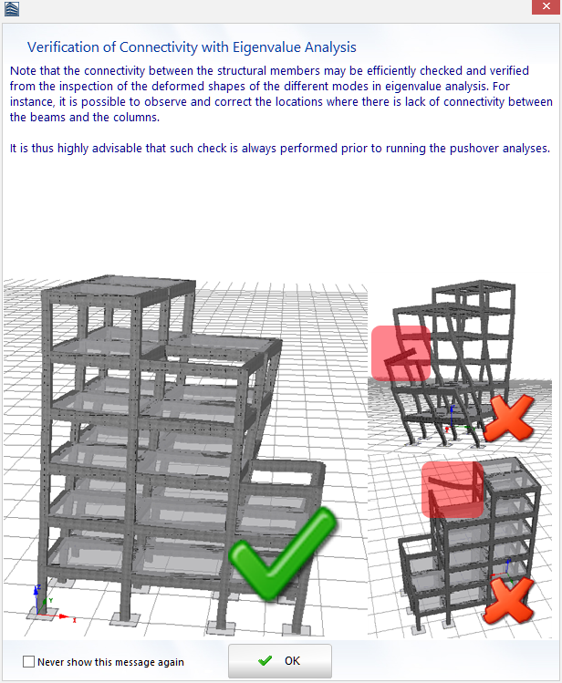 When the analysis is completed an informative message appears suggesting to check the deformed shapes of the different modes for possible connectivity problems between the beams and the columns.
