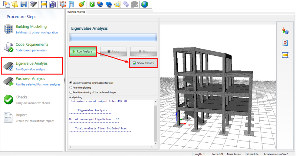 Run all the selected Linear Static Analyses, Linear Dynamic Analyses, Pushover Analyses or Nonlinear Dynamic Analyses. When the analyses have arrived to the end, you may see the results.