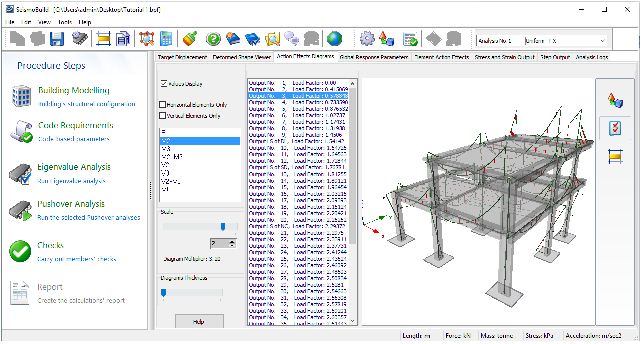 The internal forces (axial and shear) and moments (flexure and torsion) diagrams are provided in the 3D plot view. By default the diagrams for horizontal and vertical elements are shown on the same plot. If users wish to obtain the diagrams separately (for horizontal or vertical elements only), they have to check the appropriate box. The possibility of scaling the diagrams and the thickness of the lines is also available.