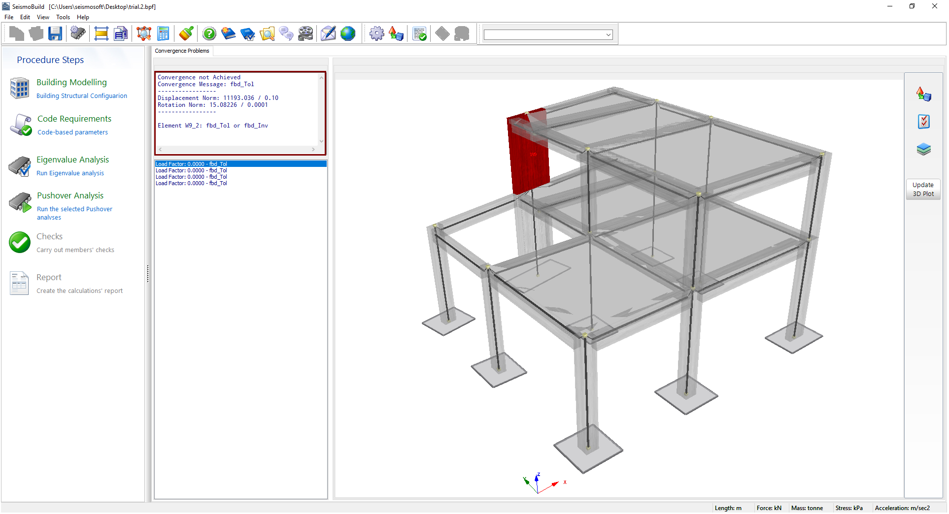 Whenever convergence problems arise, users may be informed about the elements that cause the diverging solutions. The elements or the locations of the structure, where the convergence problems are caused, are marked in the 3D view format, whereas information about the type of divergence (value of convergence norms and their limits, divergence message and the corresponding elements or nodes) are displayed on the top-left corner of the screen.