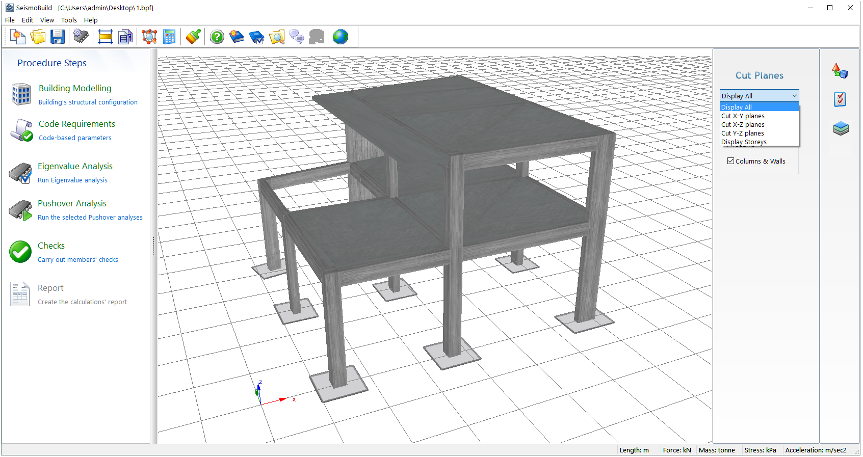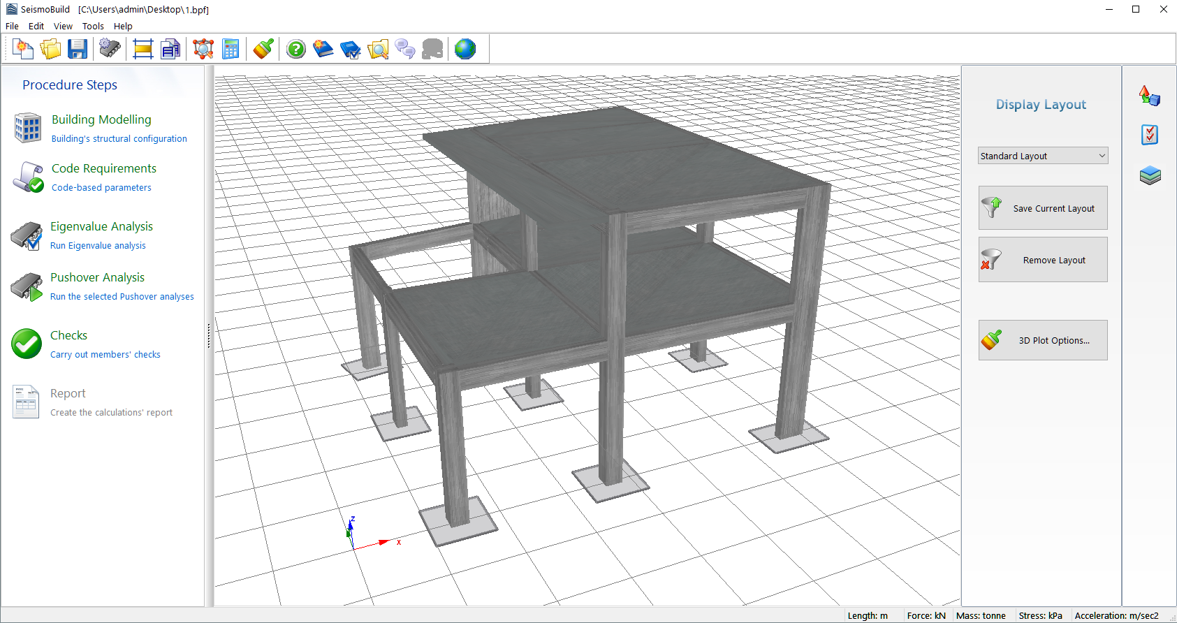 on the right, users can (i) select a pre-defined layout, such as Standard Layout (default), or Structural Model (the latter is particularly useful to visualise internal forces results), (ii) save their personal Display Layouts or (iii) change the 3D Plot Options.
