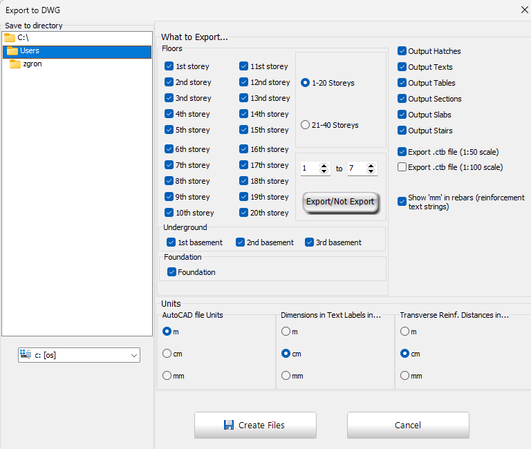 A variety of CAD drawing files of the structural model (plan views, cross sections and reinforcement tables) may be quickly created and exported from the main menu (File > Export CAD drawings), together with specially created *.ctb files that are needed for plotting.