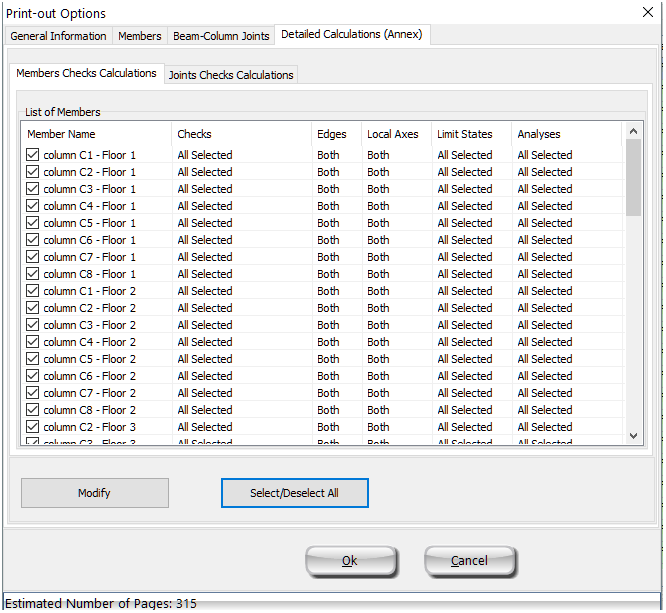 The detailed Members’ Checks Calculations may be exported to the technical report according to the employed equations of the selected Code for the calculation of the capacity values. Users may select the information to export per member, i.e. for which check type, edge, axis, limit state and pushover analysis, by selecting the member and the ‘Modify’ button. The default selection is to export all the members’ checks calculations for the selected members.