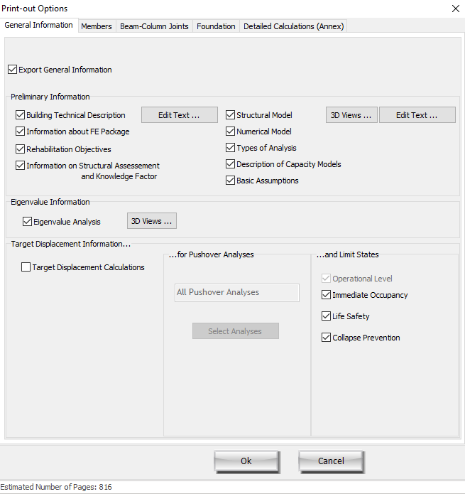 When the nonlinear static procedure is selected, the capacity curve of the structure before and after the linearization for the selected pushover analysis, as well as the target displacement for the selected limit states may be exported to the technical report. Users may define for which analyses the target displacement information will be exported, as well as for which limit states. The default selection is to export the information for all the executed analyses and for all the limit states.