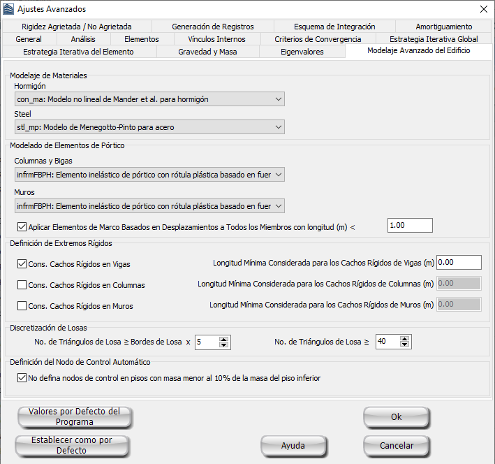 Nota: Para la mayoría de las aplicaciones no hay necesidad de modificar los valores por predefinidos en Ajustes Avanzados, ya que los Esquemas de Ajustes se han escogido para abarcar los requisitos de cualquier modelo estructural, lo cual lleva a soluciones optimizadas en términos de eficiencia en el desempeño y precisión de los resultados.