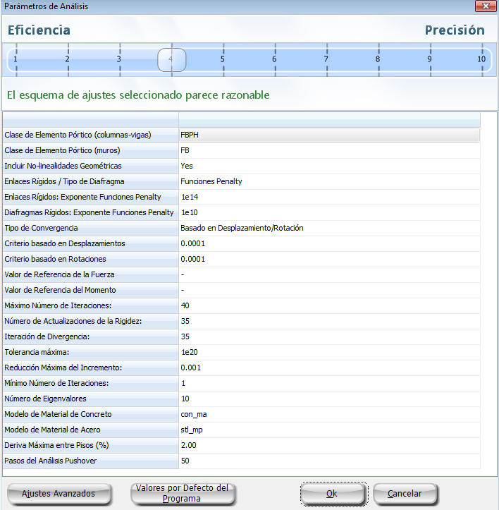 Los usuarios son capaces de definir todos los parámetros requeridos para los cálculos analíticos no lineales dentro de este módulo, al seleccionar uno de los esquemas de ajustes predefinidos, haciendo clic en el botón de Ajustes Avanzados o doble clic en un valor específico para abrir la pestaña correspondiente en el módulo de Ajustes Avanzados.