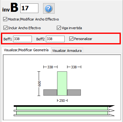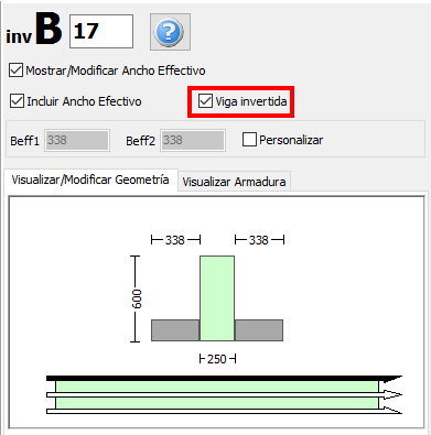 Luego de asignar vigas y losas al modelo estructural, los usuarios pueden definir losas invertidas. Para hacerlo, seleccione la viga para visualizar su Ventana de Propiedades, seleccione las cajas de Mostrar/Modificar Ancho Efectivo y Incluir Ancho Efectivo. Esta última debe estar activada, para poder activar la caja de Viga Invertida.