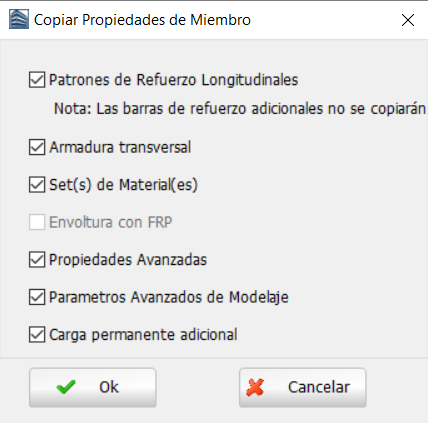 Las propiedades de un miembro pueden aplicarse a otras desde el menú principal (Herramientas> Copiar propiedades de miembros) o mediante el botón correspondiente de la barra de herramientas . Aparecerá una ventana con una lista de las propiedades que se copiarán después de la selección del miembro. Los usuarios solo deben hacer clic en un miembro para cambiar sus propiedades. Se observa que las barras de refuerzo adicionales no se pueden copiar.