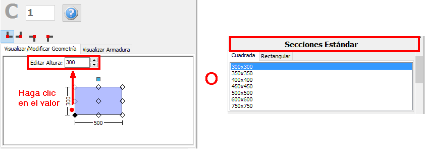 En la Ventana de Propiedades de la columna los usuarios pueden adaptar las dimensiones de la sección ya sea en la ventana de Ver/Modificar Geometría o seleccionando una sección de las predefinidas en el programa.