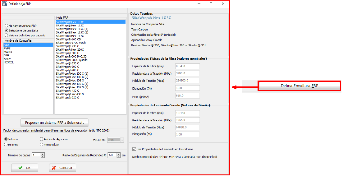 Además, las envolturas FRP pueden asignarse a las columnas a través del módulo de Envolturas FRP, donde los usuarios pueden seleccionar la hoja de FRP a pártir de una lista de los productos más comunes del mercado, o alternativamente introducir valores definidos por el usuario.