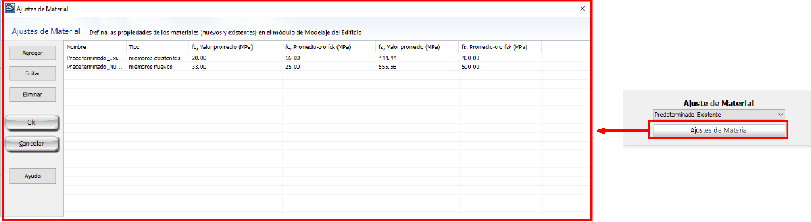 , o mediante el botón Definir conjuntos de materiales dentro de la Ventana de propiedades del miembro. Los valores requeridos para la definición de las propiedades de los materiales dependen del tipo de miembros, es decir, miembros nuevos o existentes. Por defecto, hay dos esquemas de materiales, uno para los elementos existentes y otro para los nuevos.