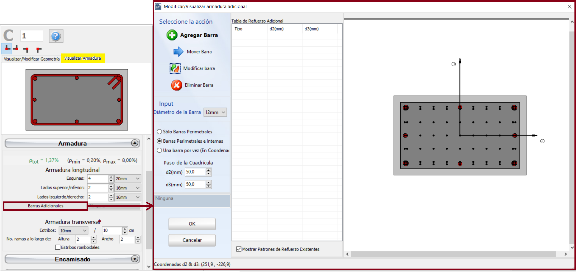 La adición de barras longitudinales únicas al encamisado también se puede realizar a través del módulo de Barras Adicionales correspondiente, donde se pueden introducir barras adicionales de forma gráfica tanto en la parte existente como en la nueva de la sección.