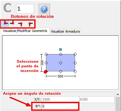 Aún más, el “punto de inserción” del elemento puede escogerse dando clic en los puntos de la esquina, el centro, o los lados de la gráfico de la sección en la Ventana de Propiedades. Se permite cambiar las dimensiones de sección dándoles clic, mientras que la rotación de la columna en planta puede cambiarse por los botones de 0o, 90o, 180o y 270o o asignándoles el ángulo apropiado en la caja de edición correspondiente de la Ventana de Propiedades.