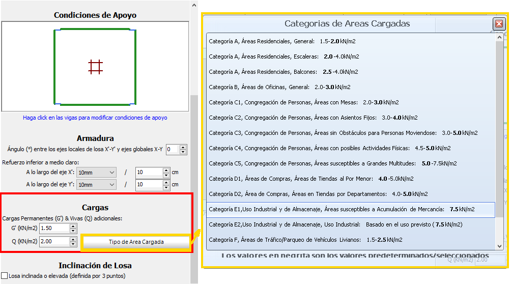 Las cargas permanentes y vivas adicionales en la losa pueden definirse ya sea manualmente o seleccionando el tipo apropiado de área cargada de la lista correspondiente.