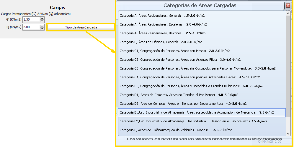 El peso propio de las escaleras puede calcularse automáticamente de acuerdo con la geometría de las escaleras, los materiales y el peso específico o se puede usar un valor definido por el usuario. Las cargas permanentes y permanentes adicionales de las escaleras se pueden definir manualmente o seleccionando el tipo apropiado de área cargada de la lista correspondiente. La carga de nieve es requerida solo por ASCE 41-23 y TBDY.