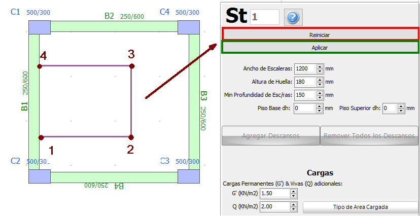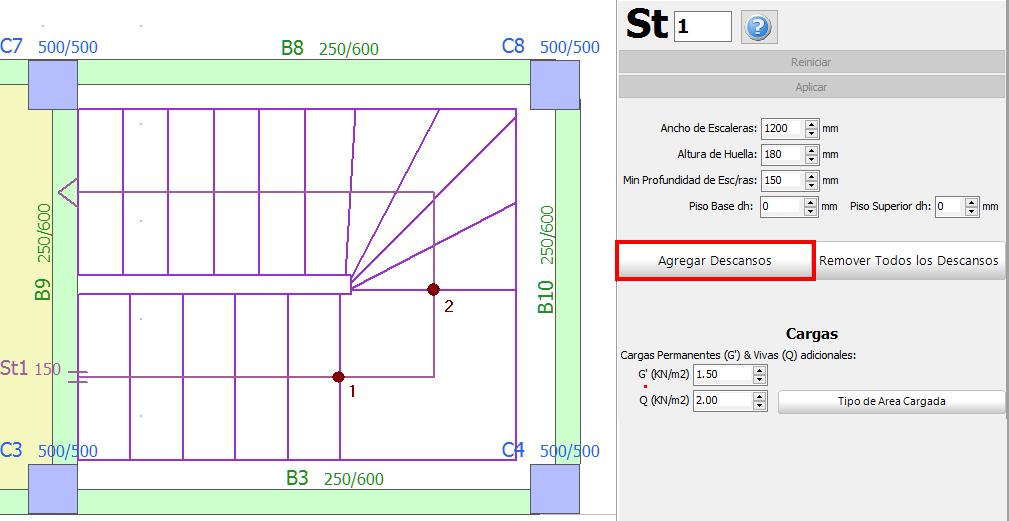 Luego de la definición de las escaleras también pueden definirse los descansos. Seleccione las escaleras y haga clic en el botón de Agregar Descansos desde la Ventana de Propiedades. Los dos extremos de los descansos necesitan especificarse gráficamente en la línea centro. Los descansos definidos pueden removerse usando el botón Remover Todos los Descansos.