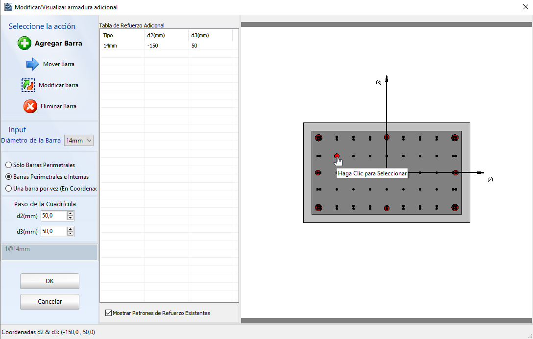 Varillas de de refuerzo adicionales pueden agregarse a través del Módulo de Varillas Adicionales disponible en la Ventana de Propiedades de las vigas, columnas y muros, donde refuerzo adicional puede introducirse gráficamente. Una vez el botón Agregar Varillas se selecciona el módulo de Modificar/Ver refuerzo adicional aparece.