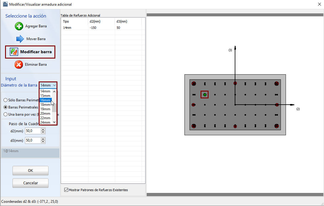 Además, los usuarios pueden modificar las varillas de refuerzo haciendo clic en el botón de Seleccionar/Modificar Varilla, seleccionar la barra para modificar y cambiar su diámetro.