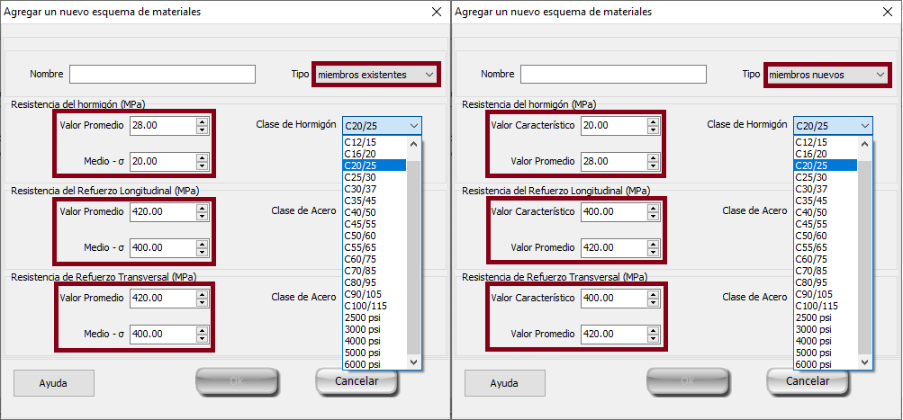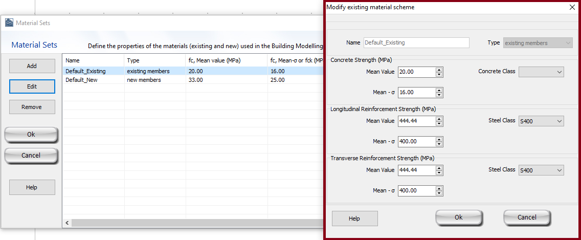 Por defecto, hay dos conjuntos de materiales, uno para los elementos existentes y uno para los nuevos. Los usuarios pueden modificar los valores de las propiedades del material para estos conjuntos predeterminados a través del botón Editar, sin embargo, no pueden eliminarlos. La opción de aplicar resistencias de material predefinidas, dependiendo del año de construcción del edificio, está disponible cuando esto está permitido desde el Código seleccionado. Se pueden definir hasta diez conjuntos de materiales simultáneamente para la misma estructura.