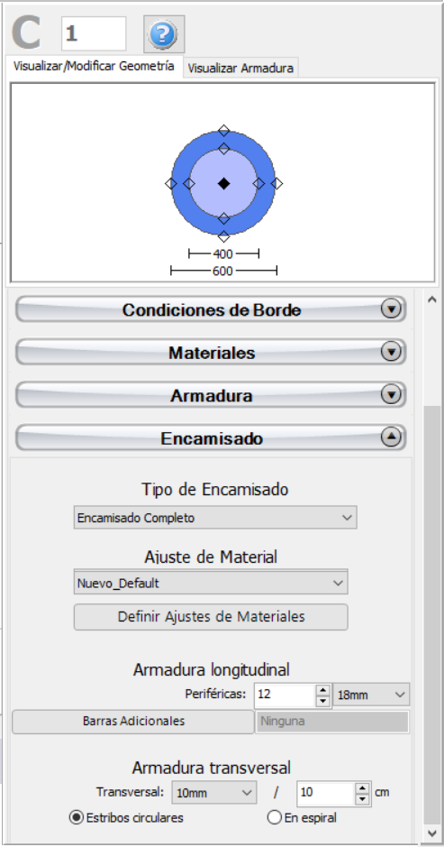 En la Ventana de Propiedades los usuarios pueden escoger Ver el Refuerzo, donde se muestra la sección y su refuerzo (longitudinal y transversal), y Ver/Modificar Geometría, donde las dimensiones de la sección pueden verse y modificarse.